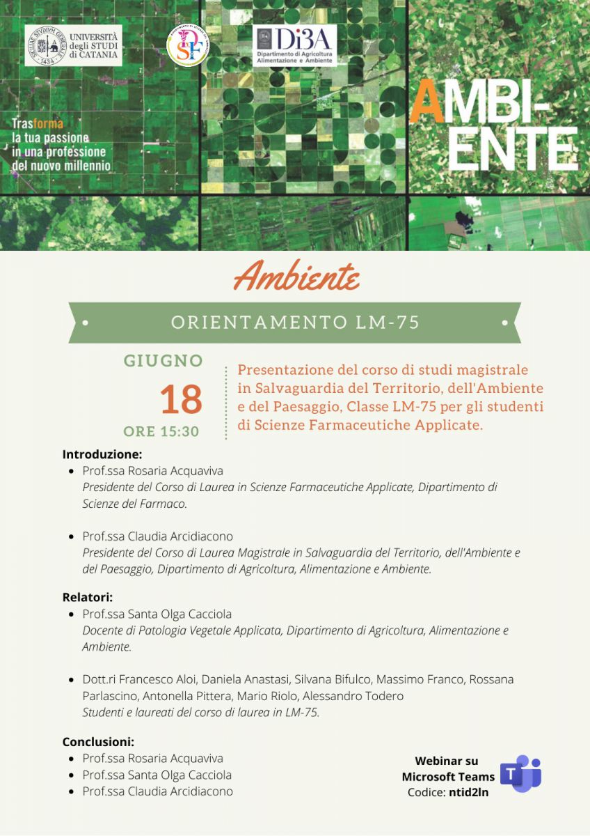 Presentazione del corso di studi magistrale in Salvaguardia del Territorio, dell'Ambiente e del Paesaggio, classe LM.75, per gli studenti di Scienze Farmaceutiche Applicate.
