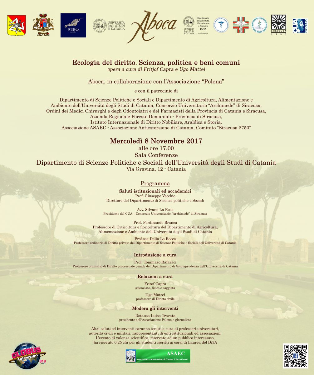 Ecologia del diritto. Scienza, politica, beni comuni di Mercoledì 8 Novembre 2017 (17.00/19.30) a Catania (sede: Sala Conferenze del Dipartimento di Scienze Politiche e Sociali di Catania - Via Gravina,12).