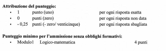 La prova verterà su n. 15 quesiti a risposta chiusa secondo quanto proposto nella prova di ammissione. Durata 60 minuti.