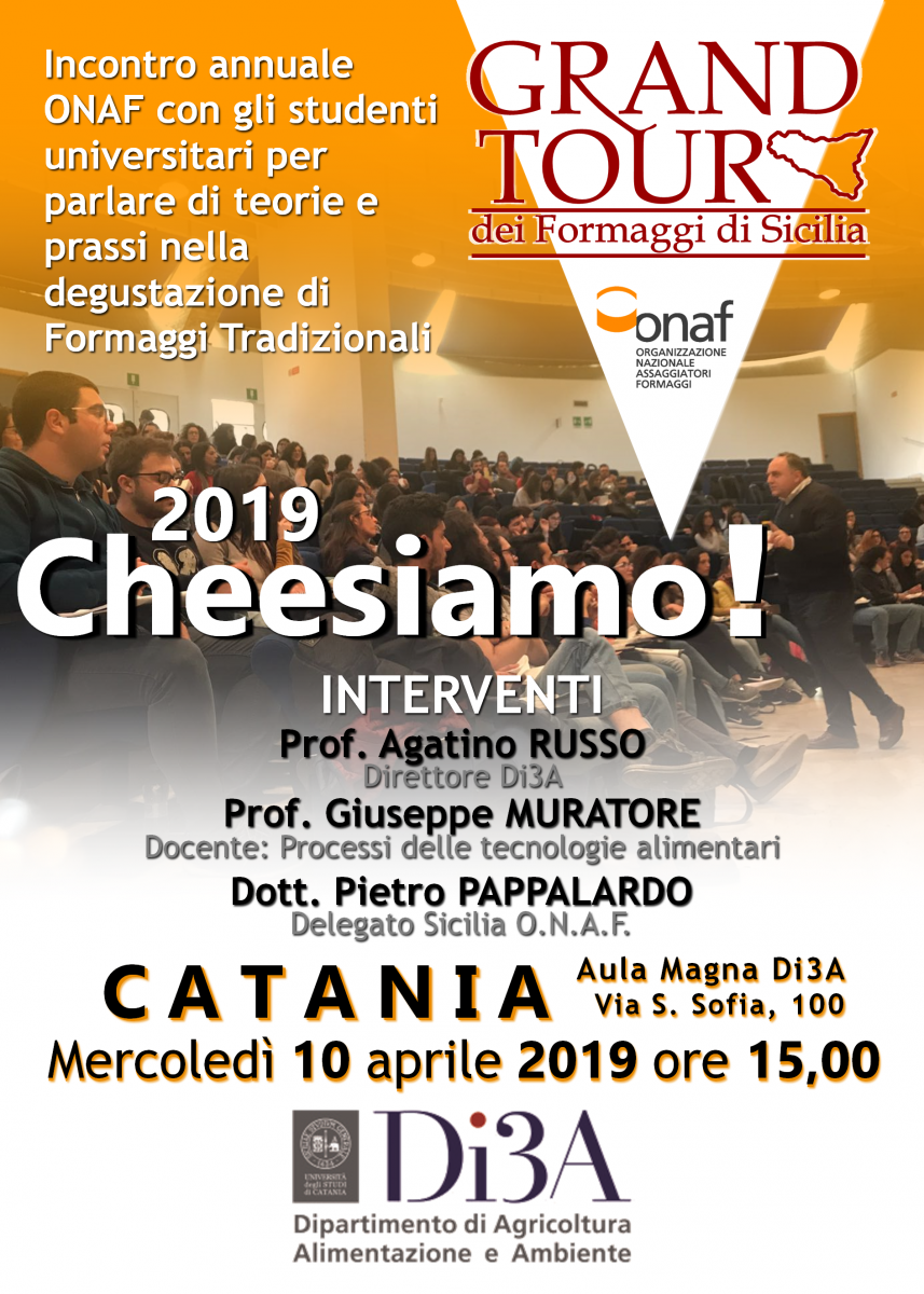 Si precisa che la manifestazione organizzata in collaborazione con l’Organizzazione Nazionale Assaggiatori di Formaggio (O.N.A.F.), relatore dott. Pietro Pappalardo, Tecnologo Alimentare e delegato Sicilia ONAF, ha l’obiettivo di fornire testimonianza dell’attività dell’associazione con particolare riferimento all’analisi sensoriale dei formaggi, e sarà tenuta nell’ambito dell’insegnamento “Processi delle tecnologie alimentari” (CdS in Scienze e Tecnologie Alimentari L26) e, pertanto, non saranno riconosciuti CFU.