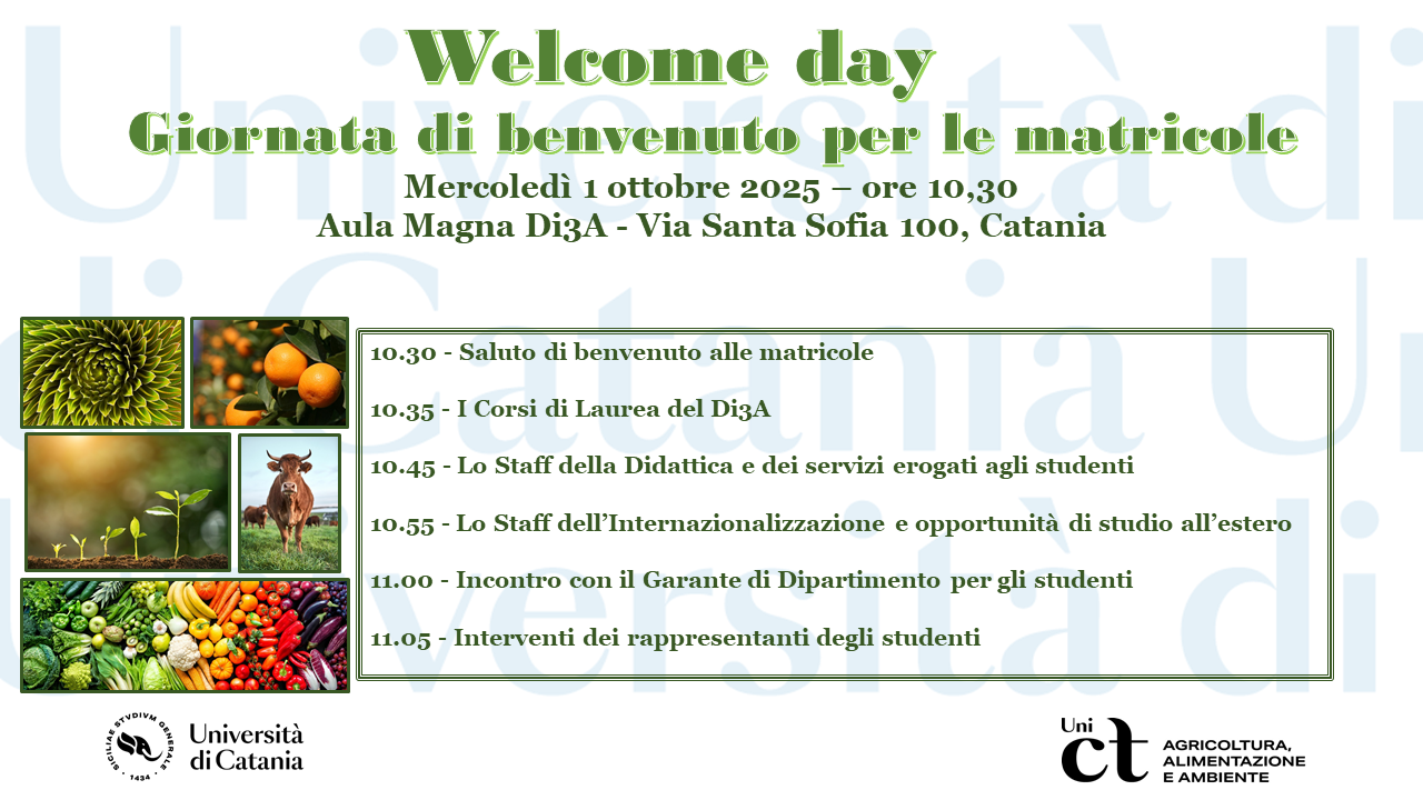 Mercoledì 1 ottobre 2024, ore 10.30, presso l'aula Magna del Di3A, si terrà la giornata di accoglienza per le matricole dei corsi di studi triennali del Dipartimento di Agricoltura, Alimentazione e Ambiente.