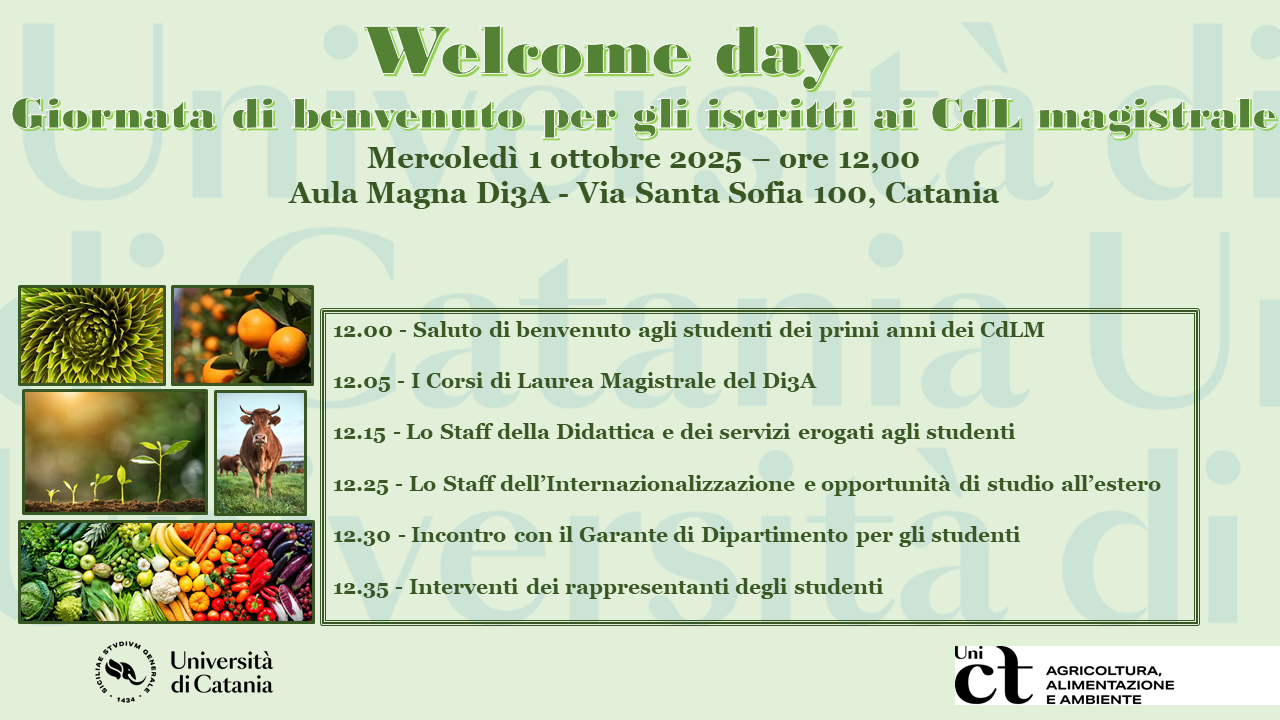 Mercoledì 1 ottobre 2025, ore 12.00, presso l'aula Magna del Di3A, si terrà la giornata di accoglienza per gli iscritti ai corsi di Laurea magistrale del Dipartimento di Agricoltura, Alimentazione e Ambiente.