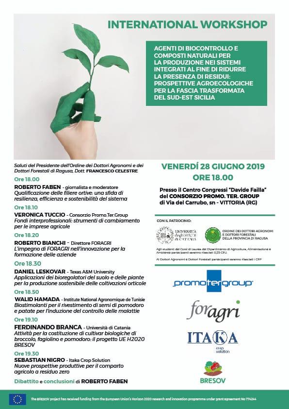 Si svolgerà venerdì 28 giugno dalle ore 18 il workshop internazionale "Agenti di biocontrollo e composti naturali per la produzione nei sistemi integrati al fine di ridurre la presenza di residui: prospettive agroecologiche per la fascia trasformata del sud-est sicilia" presso il Centro Congressi "Davide Failla" di Vittoria (RG).